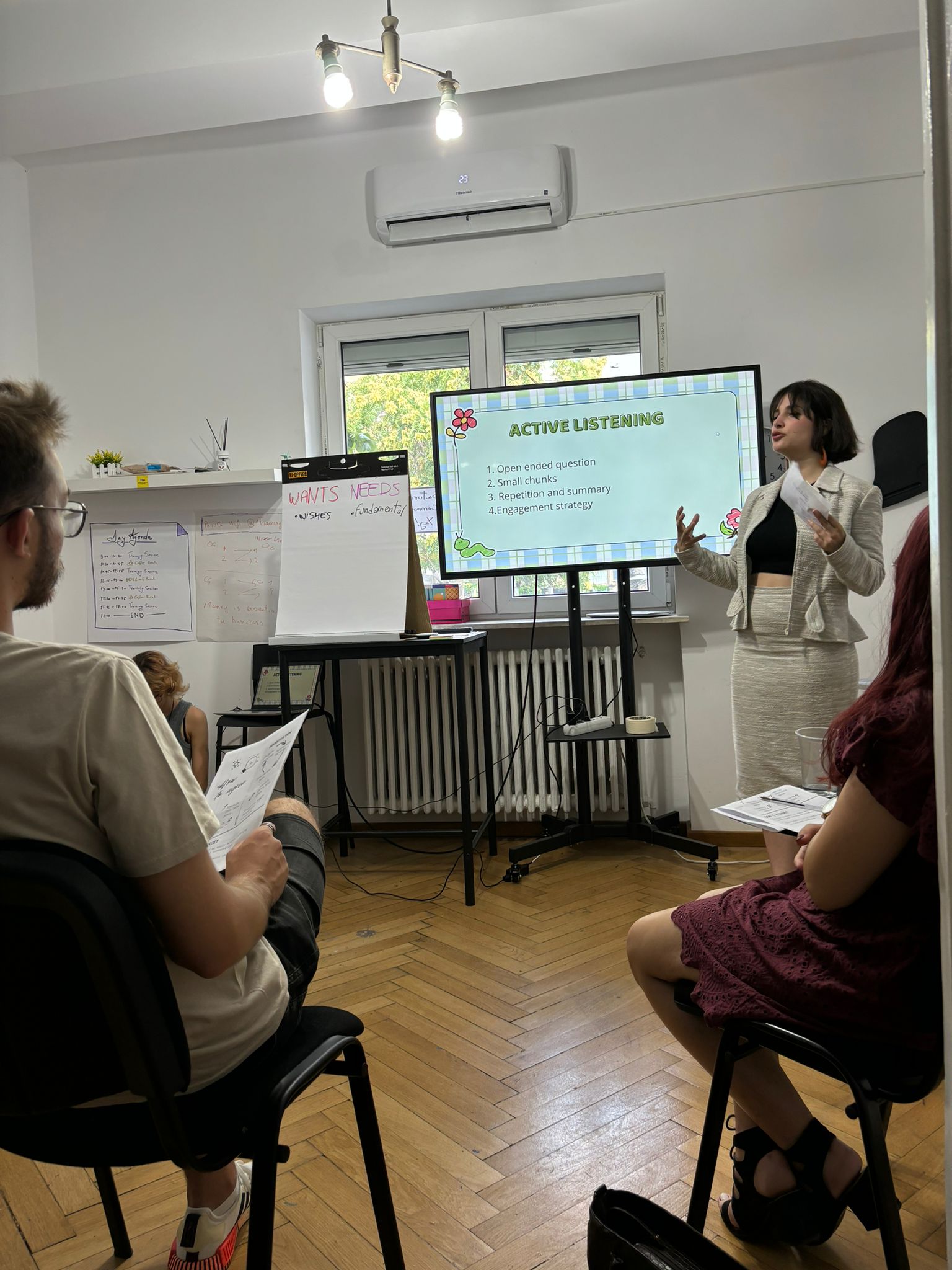 L'ultima giornata è stata dedicata ad un'attività decisamente speciale, mirata alla messa in atto delle nozioni apprese nei giorni precedenti: dopo giornate di lezioni ed esercizi e un pomeriggio dedicato alla progettazione in piccoli gruppi di brevi workshop su temi a scelta, un gruppo di graditi ospiti si è unito ai partecipanti per assistere ai loro primi business trainings e contribuire alla formazione con utili ed incoraggianti feedback.